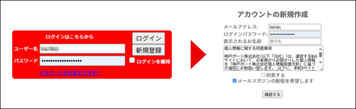 上部の新規登録ボタンを押していただくと、メールアドレスと