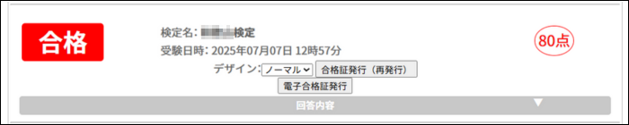 登録して検定を受験いただくと、マイページにその受験データ及び「合格証の発行ボタン」デザインの選択用プルタブが表示されます。